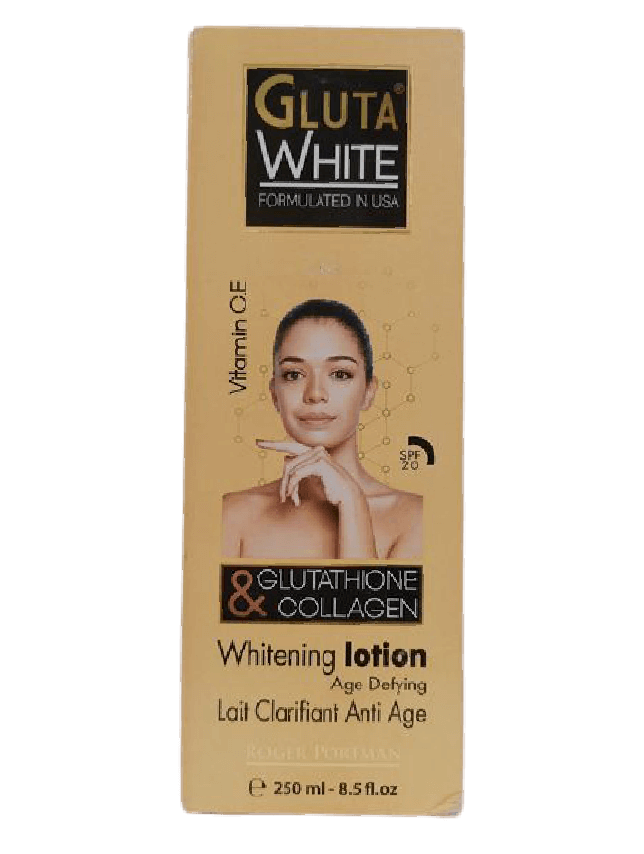 | Gluta Glutathione & Collagen Lotion.Age defying. Formulated with double actives Glutathione & collagen, gluta white clarifying lotion, moisturizes, tonifies and repairs your skin. It minimizes skin impurities, discolorations, scars, firms skin and lightens. Directions: apply it twice a day all over the body, insisting on hands, elbows and knees. INGREDIENTS: Aqua (Water), Mineral Oil, Petrolatum, Glutathione, Stearic Acid, Stearyl Alcohol, Cetyl Stearylic Alcohol, Isopropyl Myristate, Methyl Paraben, Propyl Paraben, Sodium Lauryl Sulfate, Sodium Sulfite, Sodium Metabisulfite, Propylene Glycol, Ascorbic Acid, Citric Acid, Hyaluronic Acid, Lanolin, Glycerin, Dimethicone, Soluble Collagen, Tocopheryl Acetate (Vit.E), BHT, UVA, UVB, Fragrance, Fd&c Pigments |