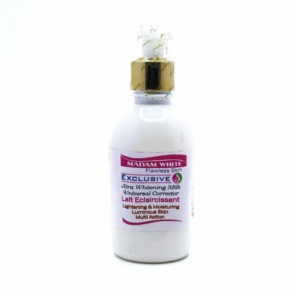 Madam White Exclusive Xtra whitening Body Lotion 250ml Madam White Exclusive Extra Whitening Milk is formulated to tackle discolouration and dark spots on African skin. The formula is moisturising, offering you a luminous looking skin. With consistent use skin is silky soft and clear in complexion. Madam White Exclusive Extra Whitening Milk Ingredients Aqua (Water), Stearic Acid, Petroleum Jelly, Mineral Oil, Paraben, Glycerin, Lactic Acid, Citric Acid, Ascorbic Acid, Kojic Acid, Carrot Oil, Fragrance